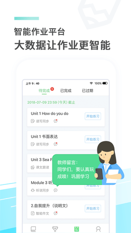 2、文本阅读:单元知识模块化朗读、智能评分。