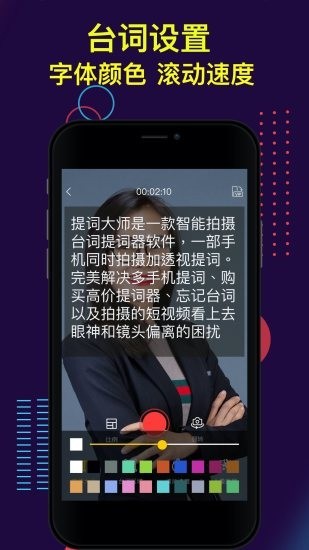 1.提词大师app支持字体颜色大小设置,支持台词区域背景透明度设置。