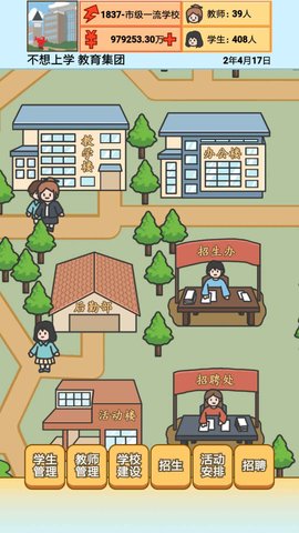 校长模拟器是一款模拟运营的手机游戏,玩家将扮演一个校长,经营自己的学校,管理学生的招聘,教师的招聘,课程的安排,学生的假期的安排,教学楼的建设,教师的工资,学生的成绩的提高等等,想要成为一个好的校长是不容易的。感兴趣的小伙伴快来下载体验吧!
