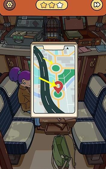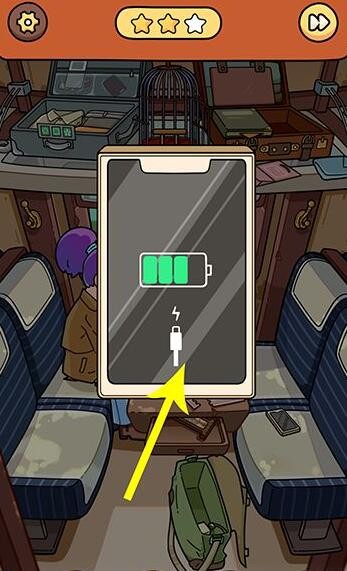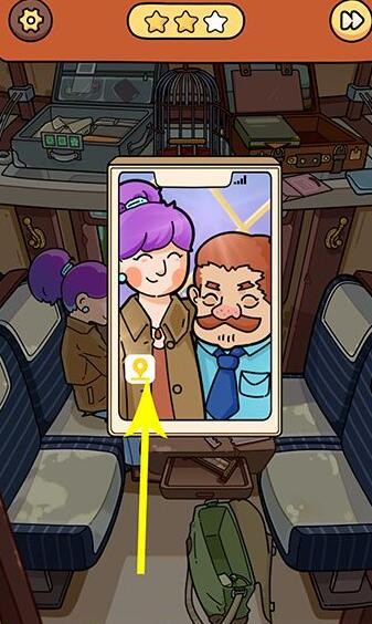 8、点击女士手里的手机,点击黄色标记点切换画面,切换后,点击红色标记点移动到上方的绿色圈内,回到火车界面,火车到站提醒后,窗户出现猫头鹰点击收起,猫头鹰列车物品找齐通关。