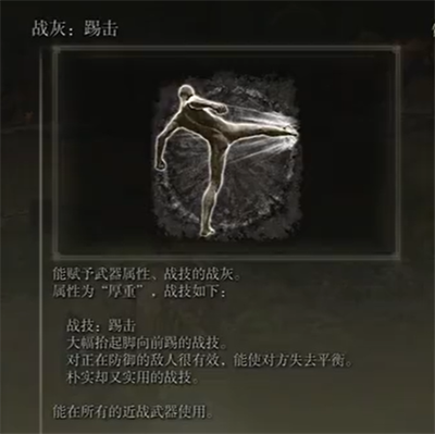 在艾尔登法环游戏中,战灰踢击是一个非常朴实无华的战技,能够让大家在使用任何的近战武器的时候使用,保证了大家在近战的时候也有多种技巧可以使用,下面就和小编一起来看看踢击这个战灰要怎么获得吧。