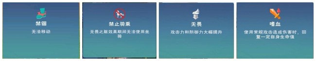使用后禁锢自身(不可安卓),9秒不能使用坐骑,增加攻击、防御,攻击附带吸血效果。