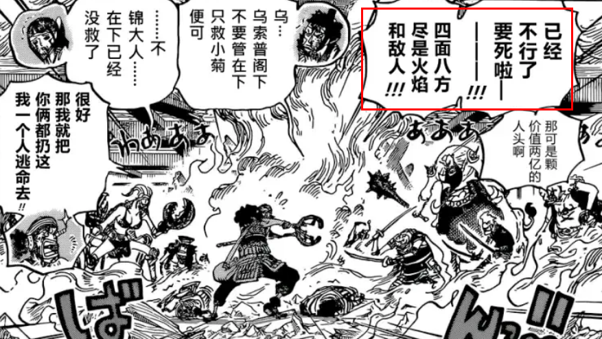 可是别忘了,鬼岛决战关系着整个和之国的命运,并不是单打独斗的PK赛。要知道如今的鬼岛各个地方大火蔓延,火势太大,诸多光月联盟参战的武士们,备受折磨,稍有不慎,就命丧火场,就连百兽海贼团的杂兵们亦是如此。