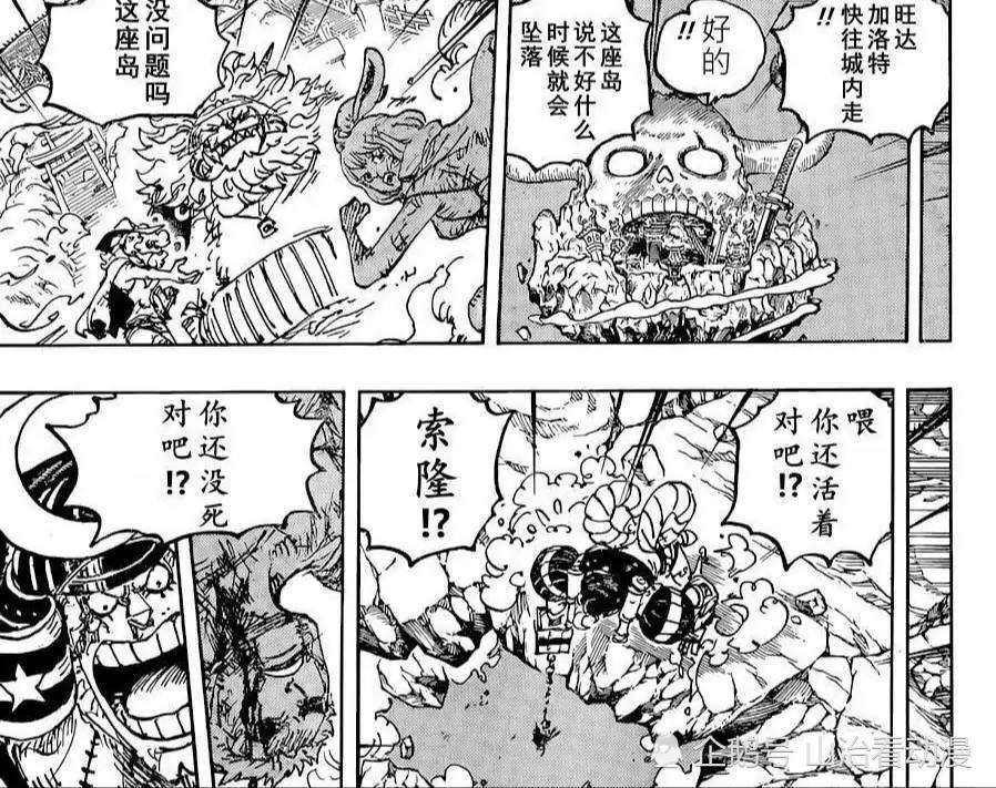 索隆只有一个分镜头,而且没有台词,不过可以确定,索隆还活着,还有一口气。山治也有镜头,他已经苏醒了,受伤并不是很严重,身边还有美女照顾他。山治已经感受到路飞的气息,他可以安心睡觉了,接下来只能依靠路飞了。草帽一伙都相信自己的船长能够击败凯多,同伴之间的信任。