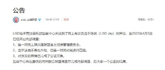 关于LGD的新闻怎么总是那么糟糕,去年Dota分部就因为假赛传闻闹得沸沸扬扬,今年英雄联盟分部,中单选手Jay陈波又陷入了假赛风波。