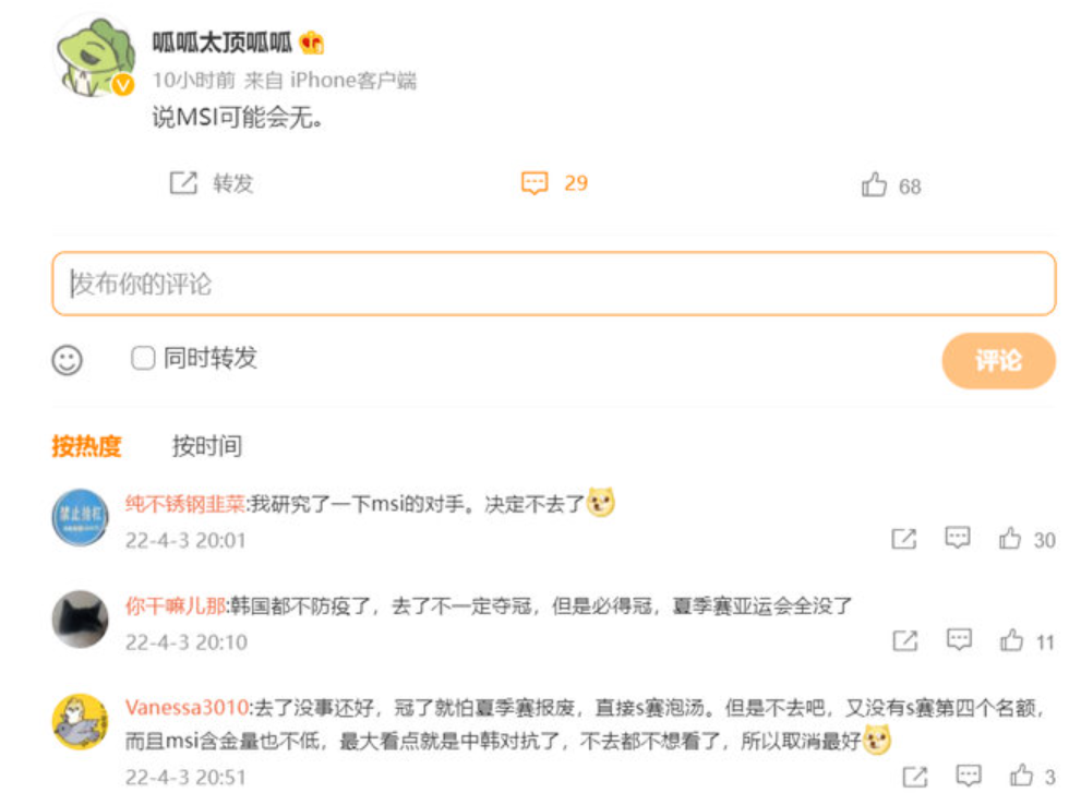 然而就在最近,Doinb也是聊到了这次MSI的安排,首先LPL的队伍是一定不可能去韩国参加MSI的,因为一旦去韩国打比赛,回来不管有没有感染新冠,都要隔离一个月,这样一来就正好错过夏季赛,所以如果这次LPL不能在线上打MSI,那么就只能够选择放弃参加,毕竟夏季赛可要比MSI重要的多,这要是为了打MSI,而没能够参加夏季赛,就很有可能要无缘S赛。