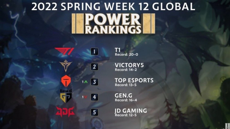 最近全球各大赛区都已经先后结束了常规赛的争夺,进入季后赛阶段。外媒League On Lock也是评选出第十二周全球各战队的实力排名,其中20连胜全胜夺冠创造LCK记录的T1继续稳居战力榜榜首,LPL常规赛第一V5也是继续位居第二,季后赛两连胜挺进四强拿到复活甲的TES久违地重回第三,LCK亚军GEN位列第四,当然这个第四还是值得推敲的。毕竟LCK决赛上GEN和T1有相当明显的实力差距,如果不是T1在第二局乱玩葬送优势,GEN可能就被剃光头了。很难让LPL观众信服GEN比第五的JDG厉害。
