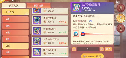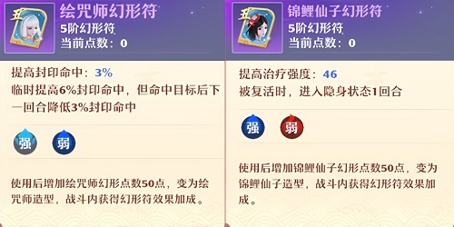 4、五阶幻形符绘咒师和锦鲤仙子,绘咒师适合搭配长生或是合欢使用,可以临时提升封系的命中效果;锦鲤仙子则是南疆和天音的首选,不仅可以提升治疗强度,而且在自身复活后隐身一个回合,大大的提升了辅助门派的生存空间,无论是三输出队还是双奶队,都值得使用。