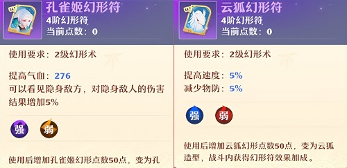 3、除了元素属性的加入,本次幻形符玩法的升级还加入了6张最新的幻形符。四阶幻形符孔雀姬和云狐,其中孔雀姬可以帮助小伙伴看见隐身单位,并且增加对隐身单位的伤害,可以配合输出职业用来对付隐攻宝宝;云狐则是提升5%的速度,减少5%的物防,可以搭配合欢等高速门派使用,但抢一速的同时需要注意生存空间。