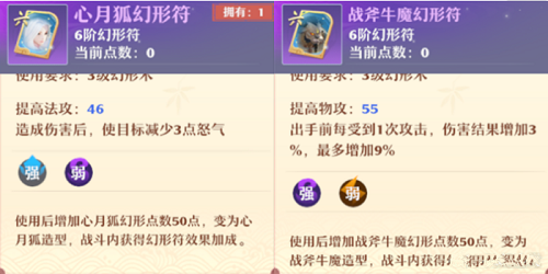 5、六阶幻形符心月狐和战斧牛魔,心月狐在提升法攻的同时可以减少目标的怒气,与法系输出门派简直是绝配,再也不用担心自己的AOE伤害会给对面送怒气了;战斧牛魔则是物理输出门派的福音,该幻形符在提升物攻的同时,还能够百分比提升伤害结果,最高可达到9%,非常适合用来点杀敌人。