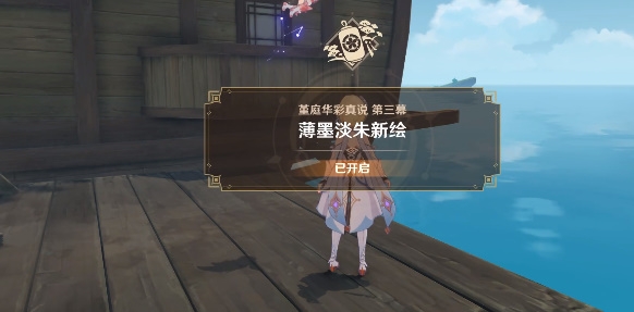 我们需要根据任务指示前往离岛码头,与万叶对话,即可开启堇庭华彩真说第三幕薄墨淡朱新绘任务,第一个任务就是到五歌仙广场寻找阿贝多,触发CG动画剧情以后,前往乌有亭。到达乌有亭以后,前往二楼与行秋对话,之后玩家就要离开乌有亭,前往水池边触发新的剧情,最后就是得到五歌仙容彩,看完CG动画即可。