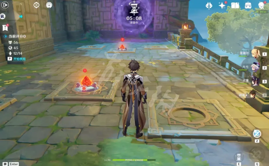 如下图,开始在入口位置2个火拆掉,前面中间的2个震弩拆掉,然后红色标记7个点摆上机关,即可开始,等攒到积分了,先摆右边的冰和火机关,然后再摆入口处的2个震弩机关。全部摆完即可挂机拿满3000分了。其他不用摆。