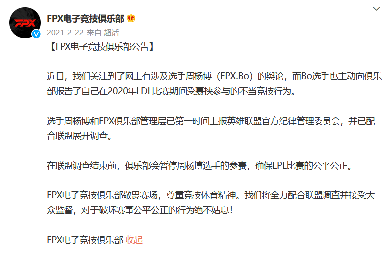 想必大家都还记得上次LPL赛区开始正式大张旗鼓惩治假赛风波是因打野bo而起,考虑到他并不是假赛的始作俑者,并且在被查证之后积极配合调查,并且尽自己所能去协助LPL官方调查小组追查根源,确实起到了戴罪立功的效果。并且考虑到打野bo是在被胁迫的情况下参与假赛,并且赛区也是第一次大规模惩治假赛风气,不仅要起到杀鸡儆猴的效果,也需要留下有人情味、奖惩分明的印象,为了呼吁当时赛区选手积极提供有关背后操盘假赛幕后主使的相关信心,并且鼓励曾经犯过错的选手自觉“自首”从轻发落,所以打野bo也成为了这次事件的“幸运儿”,仅仅受到了禁赛三个月事件的处罚。