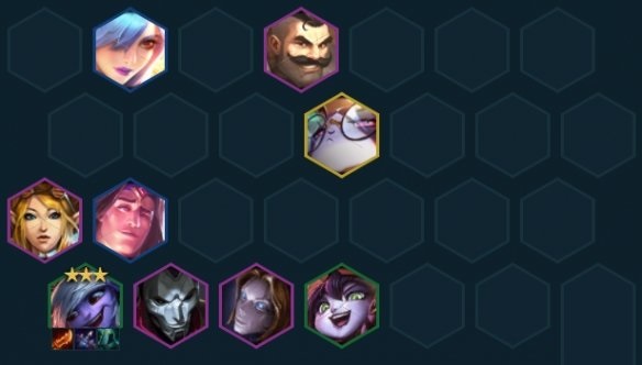5-5之前拉8,8人口大D2星4费卡,没有喵咪先上璐璐开4白魔,容错不高了的话看法在8人口玩到死追3星宝石。有狙神转可以给发条,下宝石上女警开4狙神,有条件上9能补杰斯开2执法;有白魔之心9人口补璐璐可开5白魔大提高。站位尽量跟对手站对角,切记不能跟永恩站在同一边,布隆尽量顶在对手C位的脸上早点打控制。