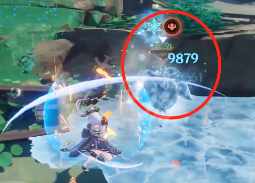 然后,找一个伤害很低的角色,慢慢磨(上面那个圆圈,是怒气值),可以看到9879也没有怒气值,所以找个1万以下单次伤害的角色,慢慢打,是一点问题也没有的。