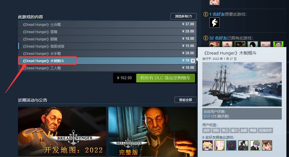 在Dread Hunger这款手游中,手游官方已经推出了好几个外观DLC,而烟斗便是外观DLC之一,小伙伴在该手游的购买页面中找到DLC页面,然后点击木质烟斗DLC后直接购买即可。