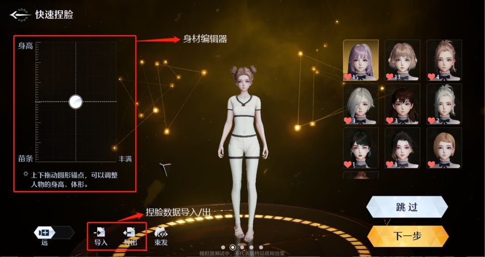 我们进入手游,选择创建角色,在我们选择好性别后便进入捏脸界面啦(性别可在手游内更换,即里/表人格切换)