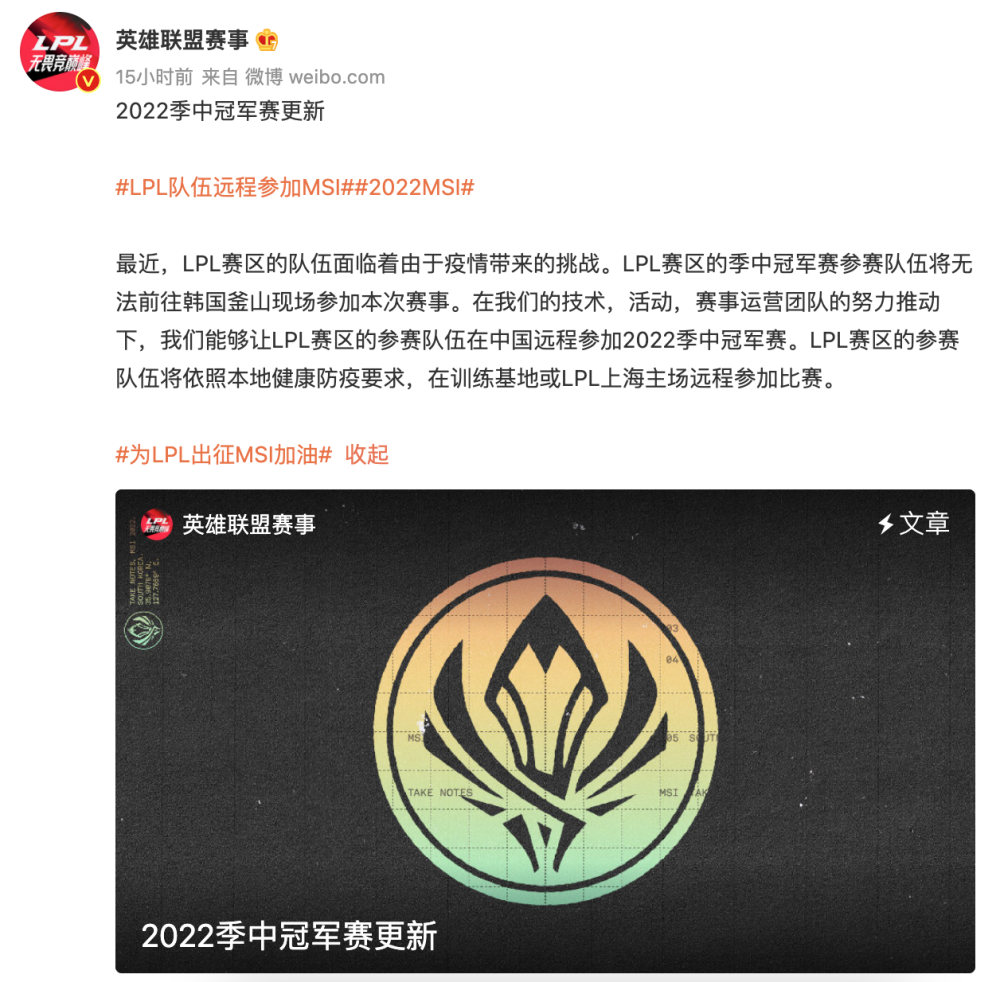 2022MSI季中赛将会在韩国釜山举办,而LCK赛区的T1、LEC赛区的G2、PCS赛区的PSG等队伍已经在备战MSI了,小组赛将会在5月10日开打,5月29日角逐出最终的冠军!然而对于LPL来说,目前上海这个特殊情况,不管是RNG还是TES,最终都没法前往韩国参赛,对此英雄联盟赛事官方公布了最新进展!为了不让MSI缺少精彩,毕竟LPL如今作为世界最强赛区,少了LPL的比赛那还不如不办了吧,所以MSI季中赛LPL将会以线上赛的形式进行,而一切都会满足!而最终是在训练基地或LPL上海主场远程参加比赛,目前还在积极的准备中!