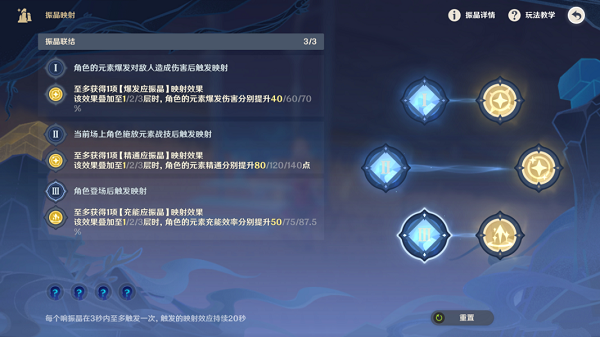 振晶映射上下半场的振晶联结映射均为全横选,即 I爆发响振晶→爆发应振晶(角色元素爆发对敌人造成伤害后触发映射效果,叠加1 层,角色元素爆发伤害提高40);