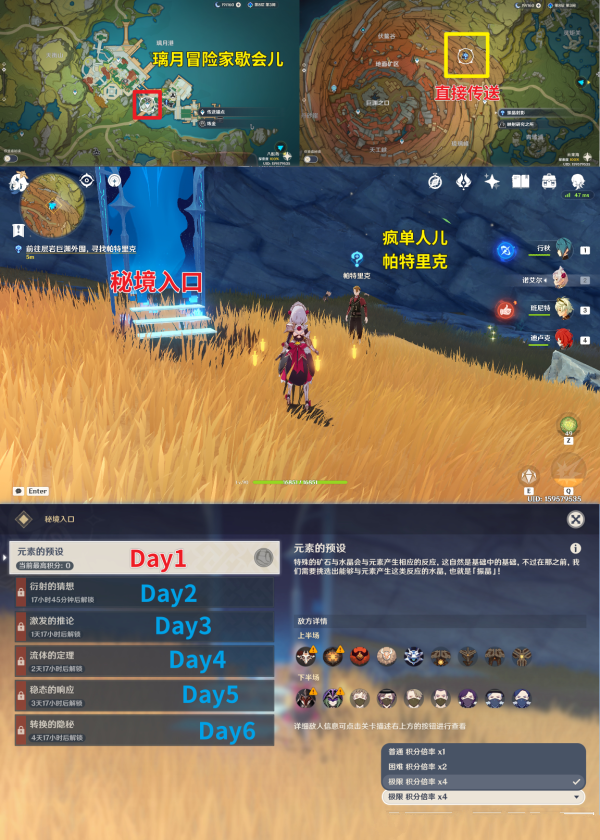 Day 1 【元素的预设】首先与璃月冒险家协会凯瑟琳交谈,然后直接传送至层岩巨渊新开秘境锚点,与NPC 帕特里克对话解锁任务后,进入秘境第一个考验【元素的预设】,选择积分倍率x4,进入单人考验。