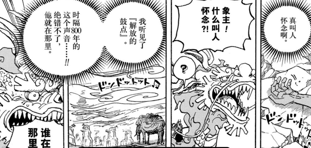 在路飞果实觉醒之后,拥有能够倾听万物之声力量的桃之助再次听见了路飞的声音,与此同时,象主以及路飞自己听见的心跳声,即为解放之鼓的鼓点声,这也让象主发觉,仿佛再次见到了乔伊波伊。