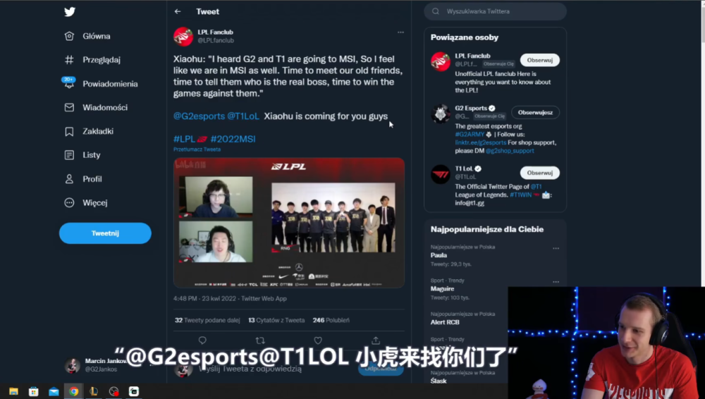 RNG夺冠,LPL官推发了翻译后的赛后采访,jankos直播观看小虎发言,“就我看到G2和T1都进了之后,感觉我们也能去MSI。都是老熟人见面,这次要找一下场子,争取赢下他们。@G2 @T1 小虎来找你们了。”