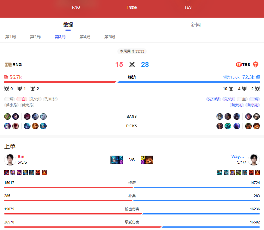 但RNG在拿着后期阵容的情况下,前期不服输的一直跟滔搏打团战,结果一波波团战下来RNG的劣势越来越大,到最后即便是阿斌的格温成型,但也无法拯救比赛了。这局比赛完全就是RNG轻敌全队上下瞎浪造成的,如果这局比赛RNG拿下了也不会有后面比赛。总体来说就是RNG在优势巨大的时候自大心态再次出线,幸亏本次世界赛他们笑到了最后,不然赛后肯定会被粉丝们口诛笔伐。