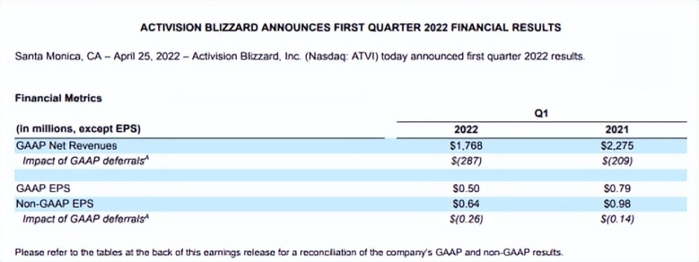 · 动视暴雪2022年第一季度收入为17.68亿美元,去年同期则为22.8亿美元,同比下滑22%。每股收益为0.64美元,而去年同期为0.98美元。这些数据都低于分析师的预期。