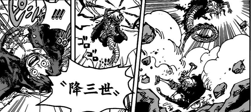 首先是在海贼王1009话《奈落》中,双方开战不久,凯多对路飞使用了“降三世·引奈落”。跳到空中,旋转着自己的铁棒,将霸王色霸气缠绕在铁棒上,向下攻击,将敌人锤到地面上的招式,溢出黑色的“闪电”,产生的攻击波能够震裂地面。