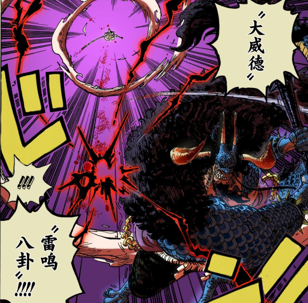 随后就是最新话1047话中,路飞觉醒之后,凯多使用了“大威德·雷鸣八卦”,这一招实际上应该是雷鸣八卦的加强版,重创了觉醒之后的路飞。