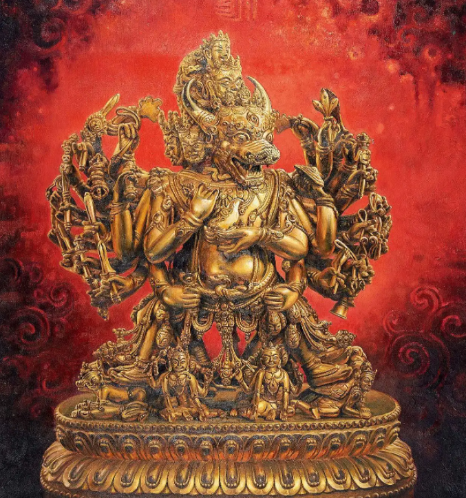 而这个“大威德·雷鸣八卦”就对应的是“大威德明王”,身是降伏魔尊,莲花部的办事明王,六面六臂六足,其中的寓意你们自行百度吧。