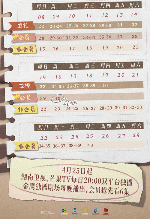 周一至周四每晚8:00点播出2集,周五至周一每晚播出1集,5月19日收官大结局;芒果TV会员: