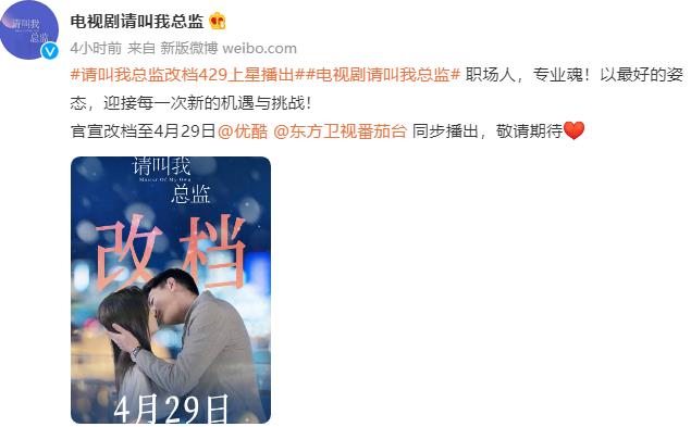 4月26日,电视剧《请叫我总监》官方微博发布消息,宣布改档至4月29日起,在优酷、东方卫视同步播出,该剧原定于4月26日播出。