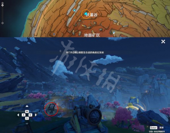 ◎来到下图位置操作大炮,将炮口左移3下、下移1下,对准图中升降机,开炮!