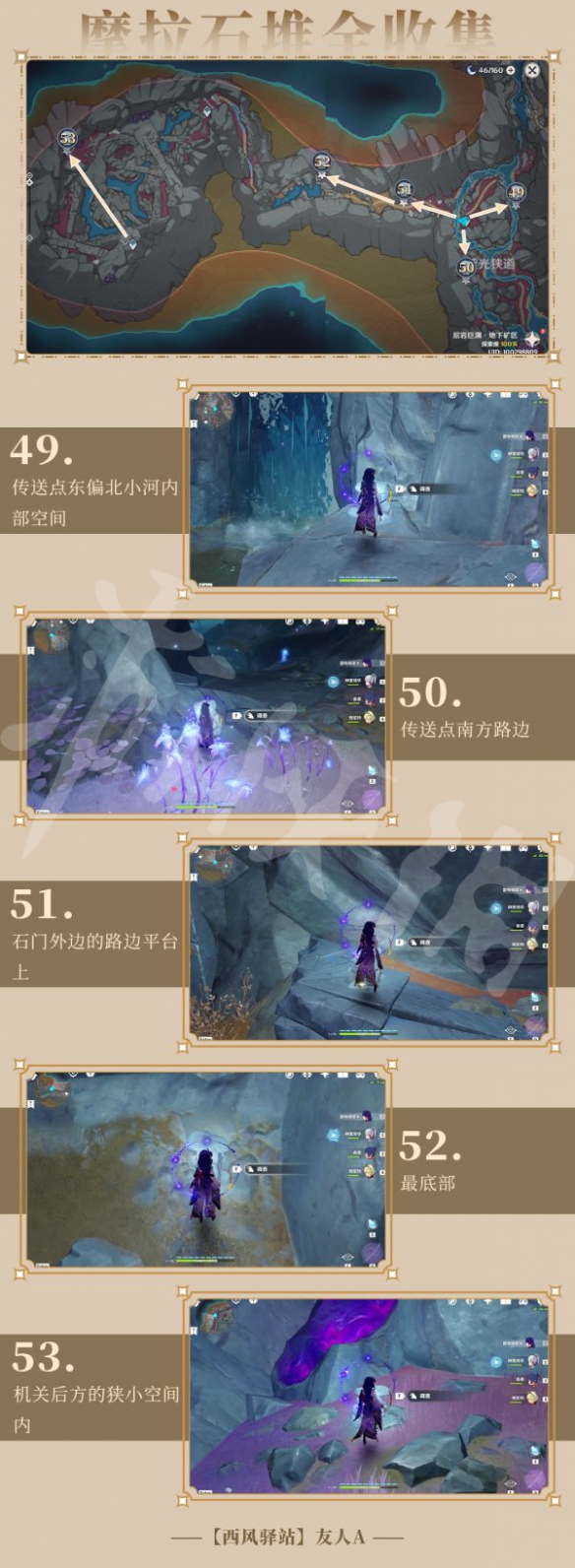 1、层岩巨渊地区共有摩拉石堆53个。其中地面25个,地下28个;