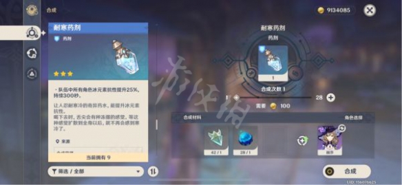 制作耐寒药剂需消耗晶核*1、冰雾花花朵*1,可使队伍中所有角色冰元素抗性提升25%,持续300秒
