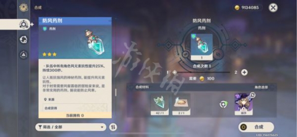 制作防风药剂需消耗晶核*1、蒲公英籽*1,可使队伍中所有角色风元素抗性提升25%,持续300秒