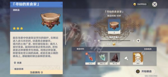 制作「寻仙的美食家」需消耗烈焰精油*1、晶核*2、铁块*2,在非战斗场景中快速搭起锅炉可以制作食物,如果附近进入战斗状态,该道具会被破坏