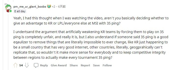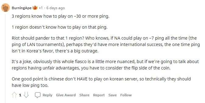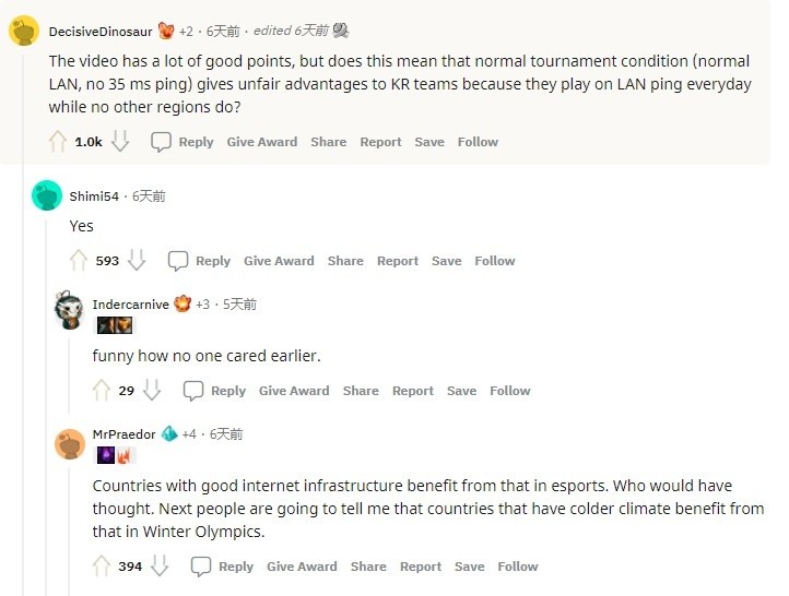 此举一出,立刻遭到了韩网友的强烈抗议。随后外网Reddit网友表示韩国作为全球赛区延迟最低的地区,在MSI上面对其他赛区(其他地区因为互联网基建无法做到如此底的延迟)是否也有优势。