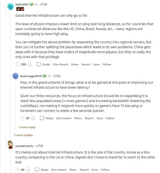 “它主要与互联网基础设施无关。这是国家的大小。与美国或中国相比,韩国是一个小国。信号不必走很远就能到达另一端(所以韩国赛区打排位近乎没延迟)”