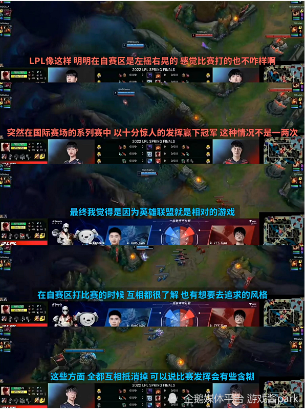 LPL春决已经结束一周时间了,游戏酱park网上冲浪的时候看到很多水友评论觉得今年的春决质量低,双方失误多。而且有不少玩家认为要不是tes最后一局bp做的不好,春决冠军还不一定是rng。我在b站也看到了lck解说对lpl春决的看法,如下图所示,还是相对比较中肯客观的。LPL在采用双败赛制后在国际赛场收获颇丰,从比赛观感来看,虽然lpl的战队在自家赛区感觉打的不咋样,但是在国际赛场的发挥却截然不同。心态,竞技状态都很不一般。再来聊聊春决,其实4强赛,v5是夺冠呼声最高的,毕竟常规赛确实打的好,节奏团战都很流畅窒息。但v5季后赛暴露的短板使其无法笑到最后。马后炮来说V5还是太依赖中野节奏了,当中野打不开局面的时候,v5就显得很被动,说白了还是体系单一。JDG也是一样的问题,打野被限制没节奏,也很难赢。