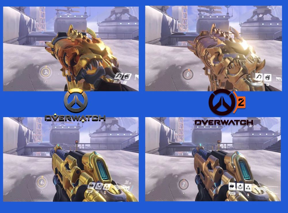 近日,《守望先锋2》玩家在社交平台上发布了一组关于1代和2代的金枪效果对比图。从图片中可以看出,2代的皮肤相比与1代缺少了部分质感,相比于1代的金光闪闪,2代的材质更像是塑料材质,看起来十分廉价。