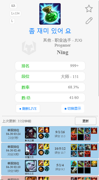 最近,S8冠军打野Ning在转会期突然重回阔别了四个月的韩服,并已经成功摆脱钻一一路冲分上了大师151分,当被网友问起为什么重新开始玩韩服的时候,宁王表示因为现在韩服没有演员了,演员号都被封了,剩下的国人就只有用超级号的职业选手了,韩国人当演员是要判刑的。
