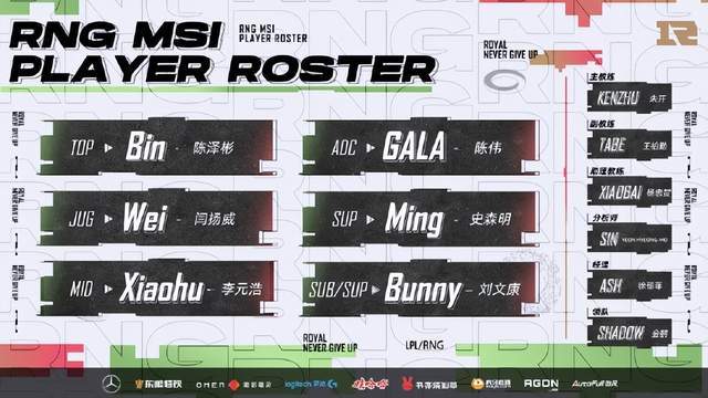 随着MSI开赛的日子越来越近,在今日RNG官博也正式公布了MSI出征大名单。跟春季赛的阵容变化不大,依旧是首发五人组加上替补辅助Bunny。值得一提的是,教练方面朱开与Tabe一主一副两位教练也将随队出战本次MSI,对于Tabe来说这次总算不用为签证问题困扰,因为这次全队都是以线上形式参赛。