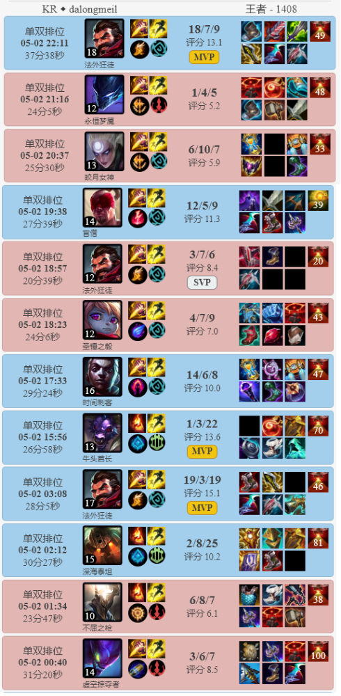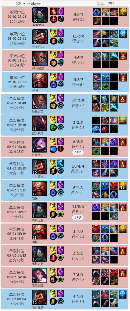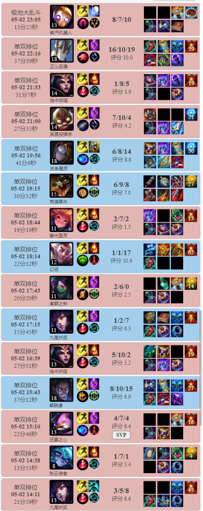 5月2日全天rank,小虎宗师605分,14场排位+1场大乱斗,5胜9负。