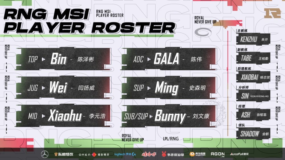 主教练朱开,副教练Tabe,助理教练xiaobai,上单Bin,打野Wei,中单xiaohu,AD Gala,辅助ming,替补辅助Bunny。