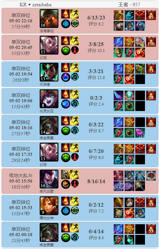 小明王者957,8场排位+1场大乱斗,6胜2负。