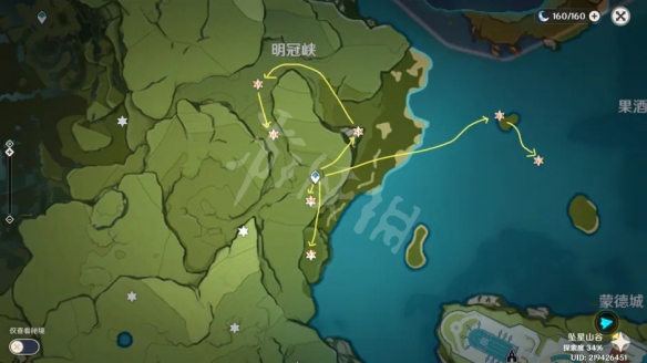 第四站晨曦酒庄,这个做主线魔神任务时候会过来,可以顺便直接拿了了,图片位置和路线如图,一共3个。18号在晨曦酒庄房顶,找个合适位置爬上去就可以了,19号在西南方向的河里,同样用凯亚铺冰就可以了,20号在空中,爬到旁边的山顶上,会有风元素石碑,激活后用风种子飞上去,就可以了。