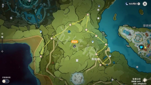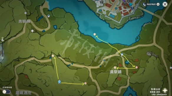 第三站清泉镇,香菱任务会过来,我们就从这里开始下一站,风险度不高,加上旁边的一共5个,一起拿了。大概位置路线如图。13号在水里,用凯亚铺冰过去蹦一下就可以,14号在猎人杜拉夫家房顶上,找个合适位置爬上去就可以。