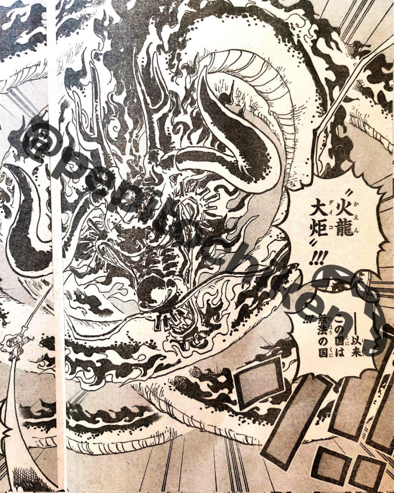 本话的主要内容依然是围绕着“路飞与凯多”的大战,战斗过程中凯多化身火龙,呈势不可当,仿佛要将路飞整个吞噬。随后凯多使出一招“火龙大炬”来攻向路飞,由于路飞之前始终处于抓住凯多的状态,所以一时间没有办法脱身。如果路飞想要脱身或者不想受到任何伤害,必然要先行放手,不过路飞显然并不想这么做。